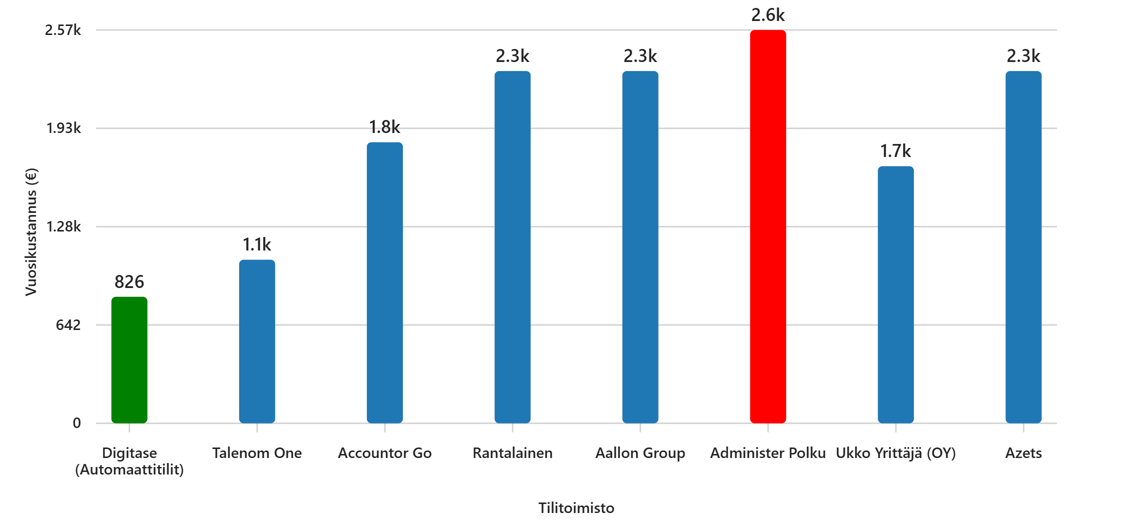 Vertailutiedot Copilot haki verkosta ja vertailu tehtiin vuoden kirjanpitokustannusten osalta. Kyse oli 50 000 euron liikevaihtoa tekevästä osakeyhtiöstä, jolla on noin 50 tilitapahtumaa kuukaudessa. Huomionarvoista on kuitenkin se, että Automaattitilit hinnoittelussa tapahtumien tai liikevaihdon määrä ei suoraan vaikuta kiinteään hintaan, mikä tekee kustannusten ennustettavuudesta oleellisesti helpompaa verrattuna useisiin verrokkipalveluihin.