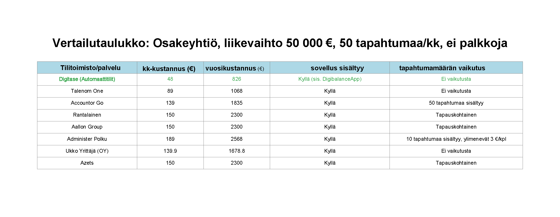 Vertailusta pyrittiin jättämään pois pilvipalvelut, joissa yrittäjä joutuu itse osallistumaan kirjanpidon kirjausten tekoon ja ottamaan mukaan vain palveluja, joissa on mukana myös kirjanpitäjät. Digitaseen kirjanpitäjätiimi on tavoitettavissa klo 8–20, joten apu on aina lähellä.